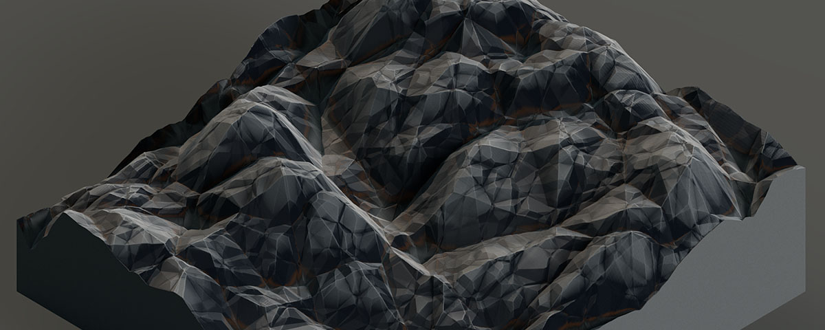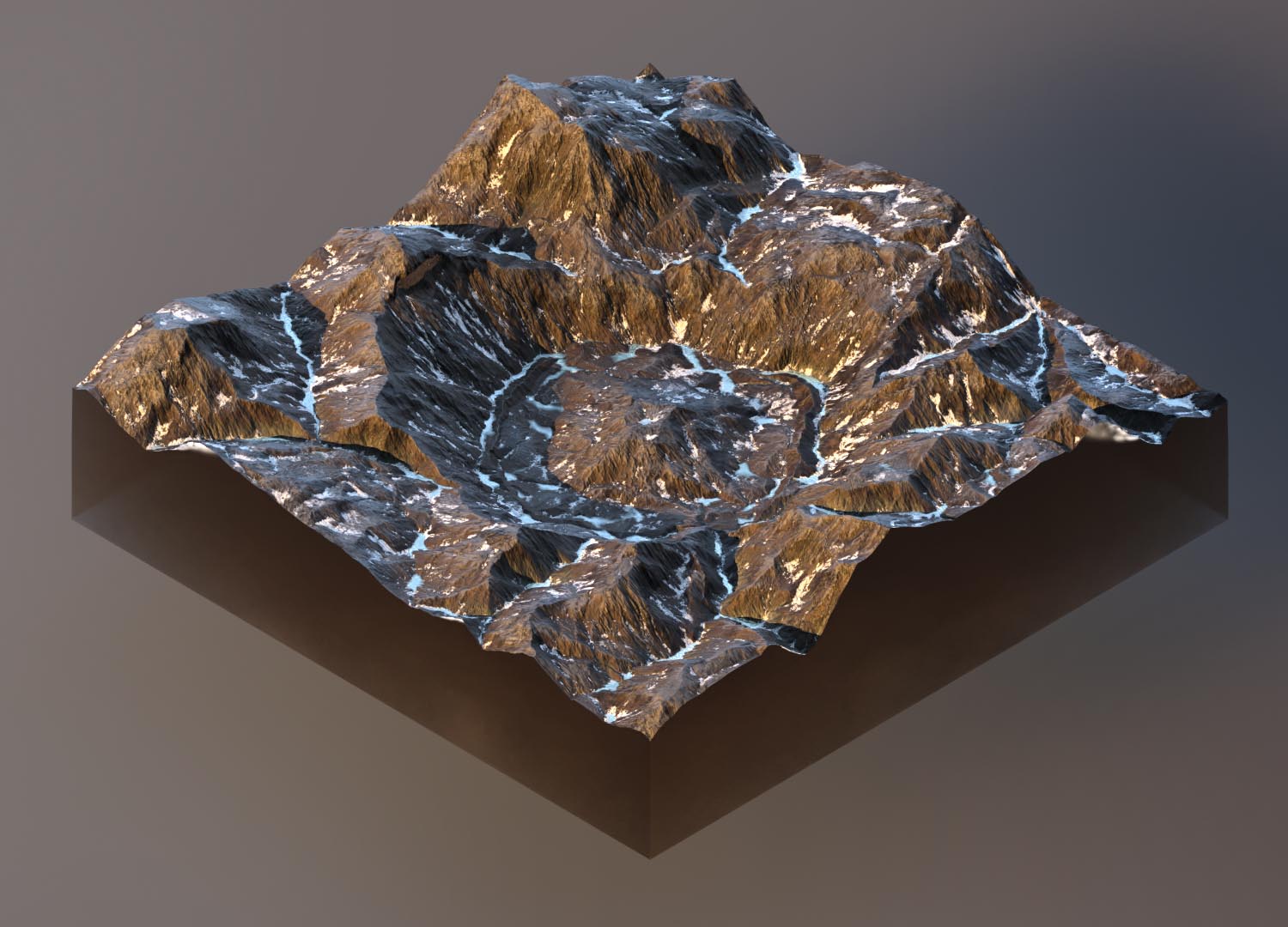 At lower altitudes we begin to see some greenery and waterways as the temperature rises and snow becomes meltwater. This was relatively straightforward to achieve. First I generated a heat mask, using altitude as the primary driver, but also mixing some occlusion in there to simulate how areas with a large amount of shadow would be less likely to heat up form direct sunlight.
