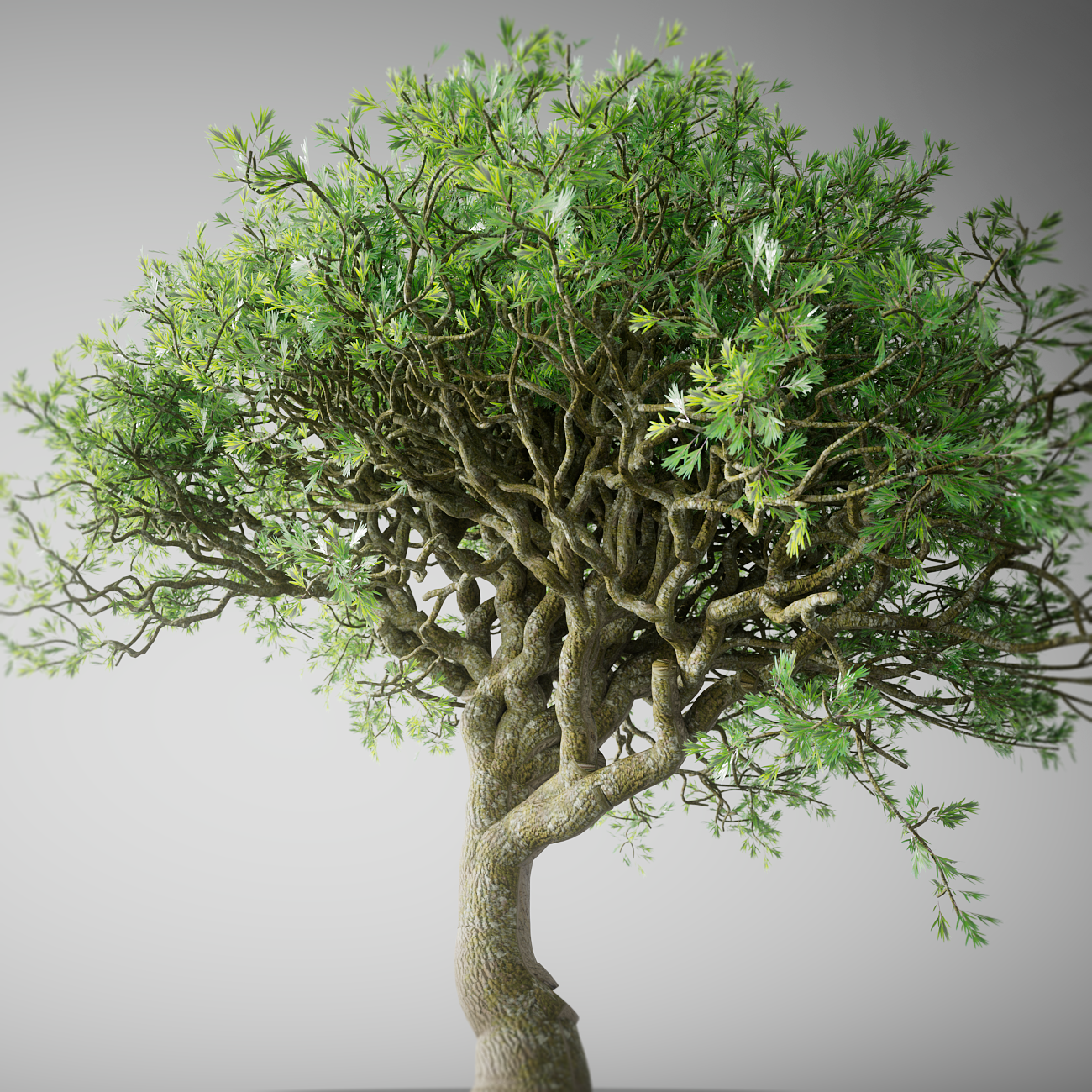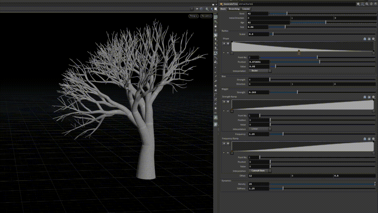 I spent a lot of time fine tuning the density and kangular parameters on each point of tree. I was happy to find that deriving these from the radius produced correct looking motion at different thicknesses of the tree.