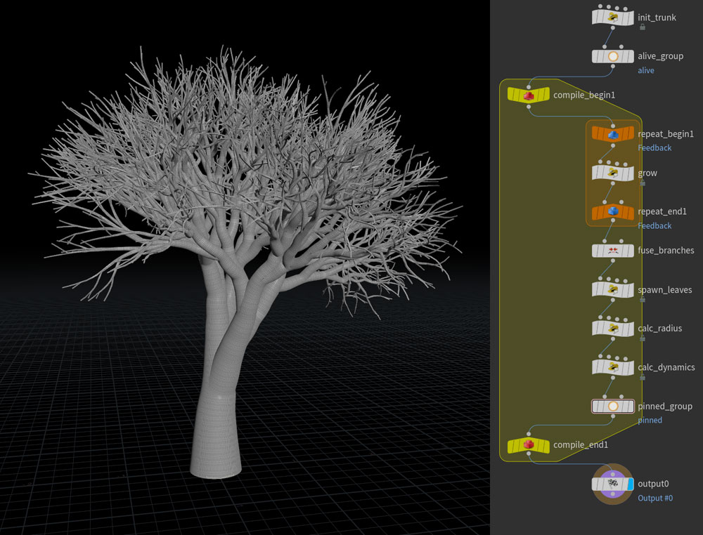 Most of the work is done in the 'grow' node. The general idea is that we seed the graph with a single 'trunk' branch primitive. The repeat block loops over 'alive'' primitives X number of times (the life of the tree). Each iteration we: